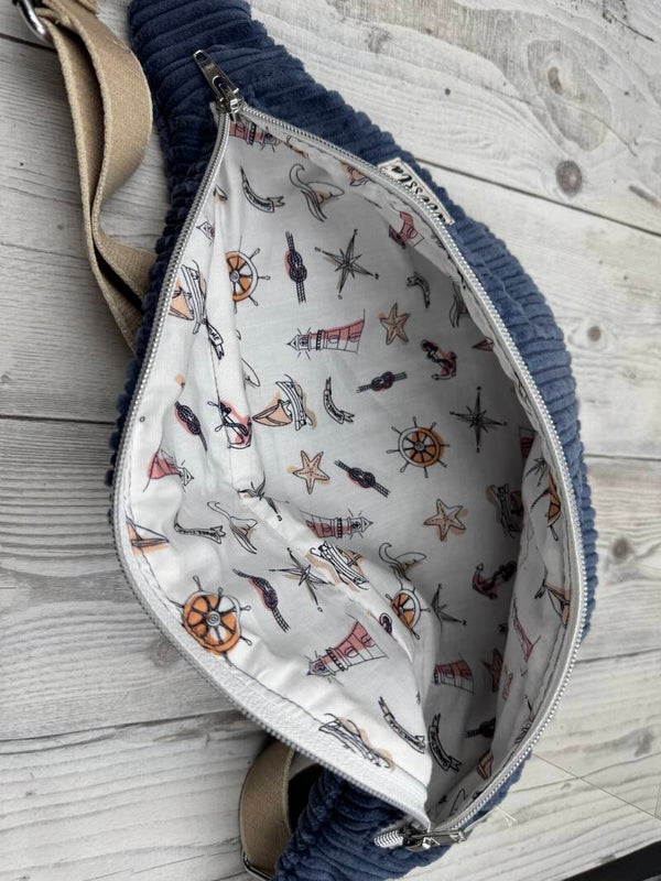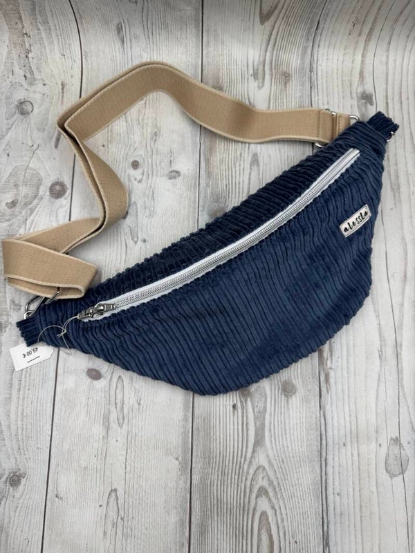 Die jeansblaue Bauchtasche aus Cord verfügt über einen silbernen Reißverschluss auf der Vorderseite, der sich dank zwei Zipper in beide Richtungen öffnen lässt.